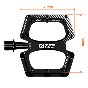 TATZE schrumpft für das brandneue Kinderpedal nicht einfach ein Erwachsenenmodell, sondern entwickelte eigens eine leichte Achse und passt die Materialstärken an. Kleine Pins sorgen für viel Grip auf dem CNC-gefrästen Pedalkörper.