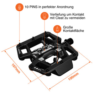 Auf der Flatseite sorgen 10 PIN´s mit gezielter Überhöhung für enormen Grip, aber auch auf der Klickseite wird mit großen Auflageflächen eine besonders satte Verbindung zwischen Pedal und Schuh hergestellt.
