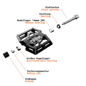 Quality and durability are especially important for a gravity pedal and are ensured by the CNC-milled pedal body, the high-strength steel axle, and the high-quality bearings (large ball bearing + wide Needle roller bearing).
