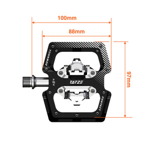 Platform with 88x97mm (WxL) and with the 9 optimal PINs can intensify the contact to the shoe. Those who also use a shoe with a long recess for the cleat (e.g. Shimano AM series) can place the shoe over the binding, turning the CONTACT DH into a flat pedal.
