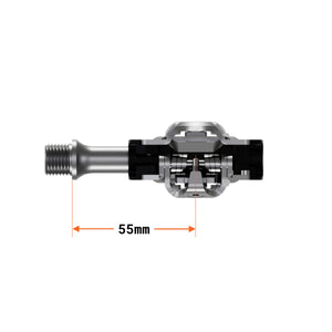 Das DC hat einen Q-Faktor von 55 mm. Durch die Positionierung des Cleats lässt sich der Q-Faktor um ca. ±2,0 mm pro Seite anpassen, sodass insgesamt ein Bereich von 52,5 bis 57,5 mm möglich ist.