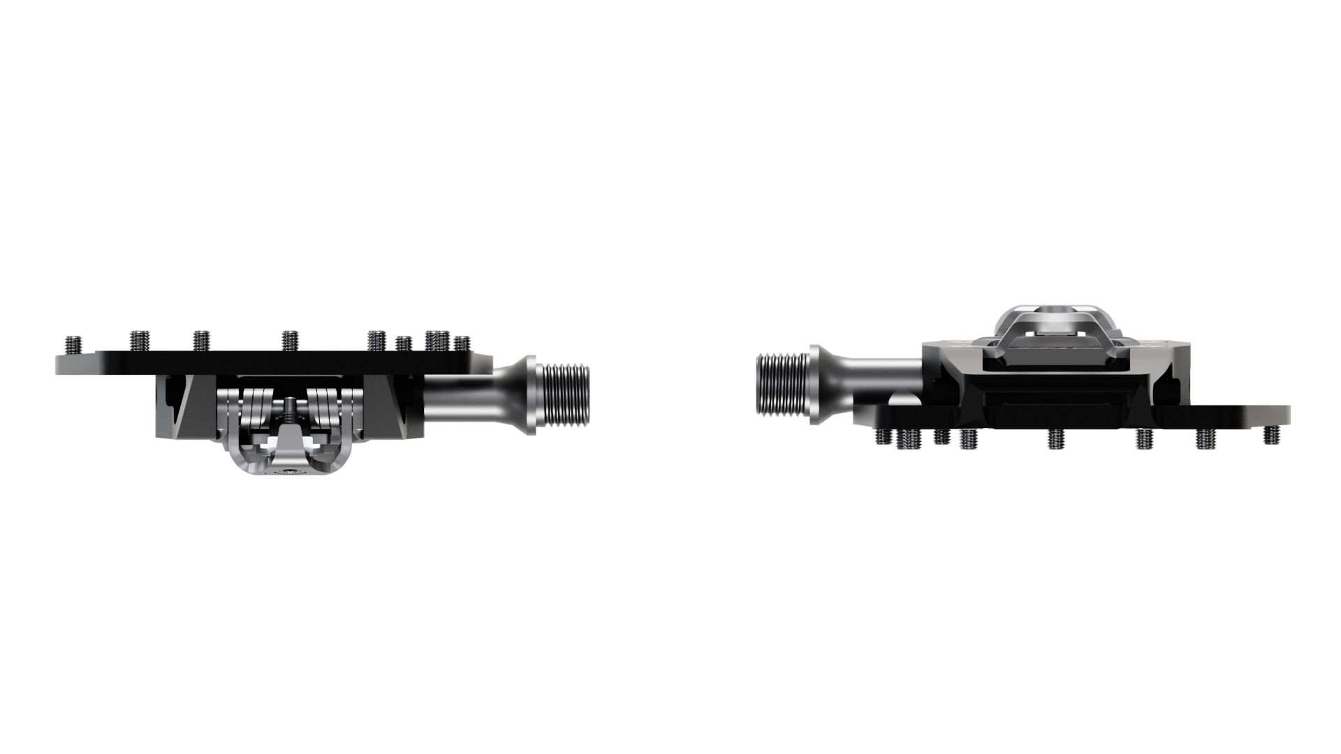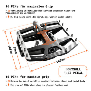 16 pins with targeted elevation provide enormous grip, and a depression in the middle of the pedal body ensures there is no metallic contact between cleat and pedal.