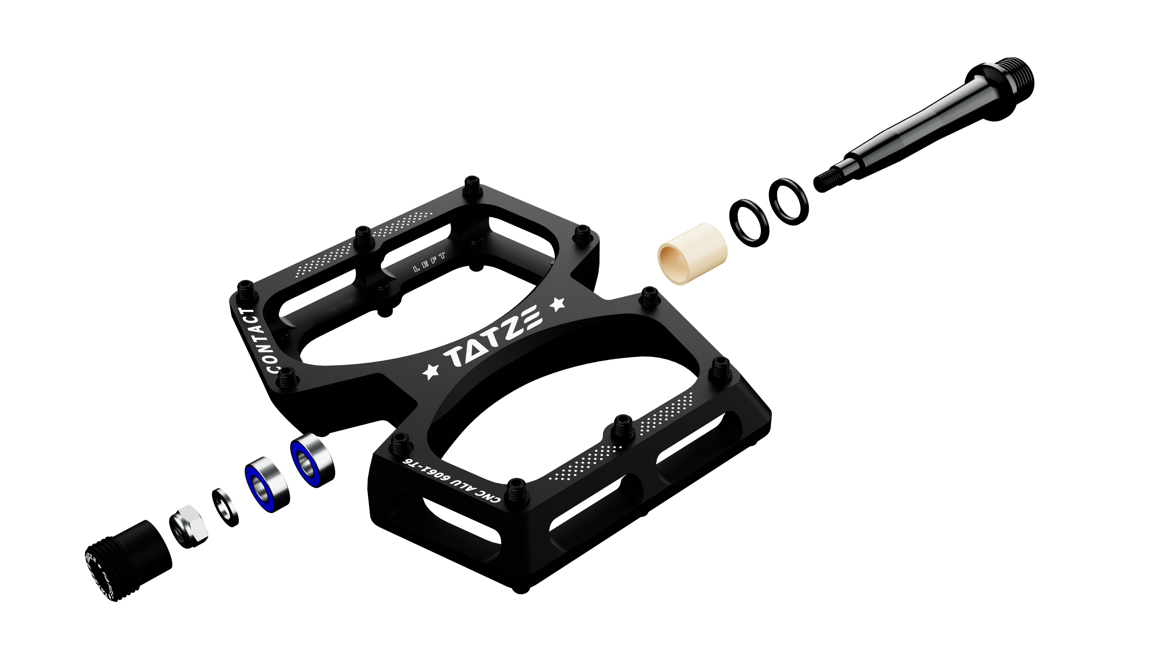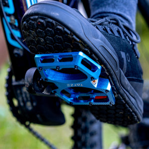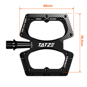 TATZE schrumpft für das brandneue Kinderpedal nicht einfach ein Erwachsenenmodell, sondern entwickelte eigens eine leichte Achse und passt die Materialstärken an. Kleine Pins mit anpassbarer Überhöhung sorgen für viel Grip auf dem CNC-gefrästen Pedalkörper.
