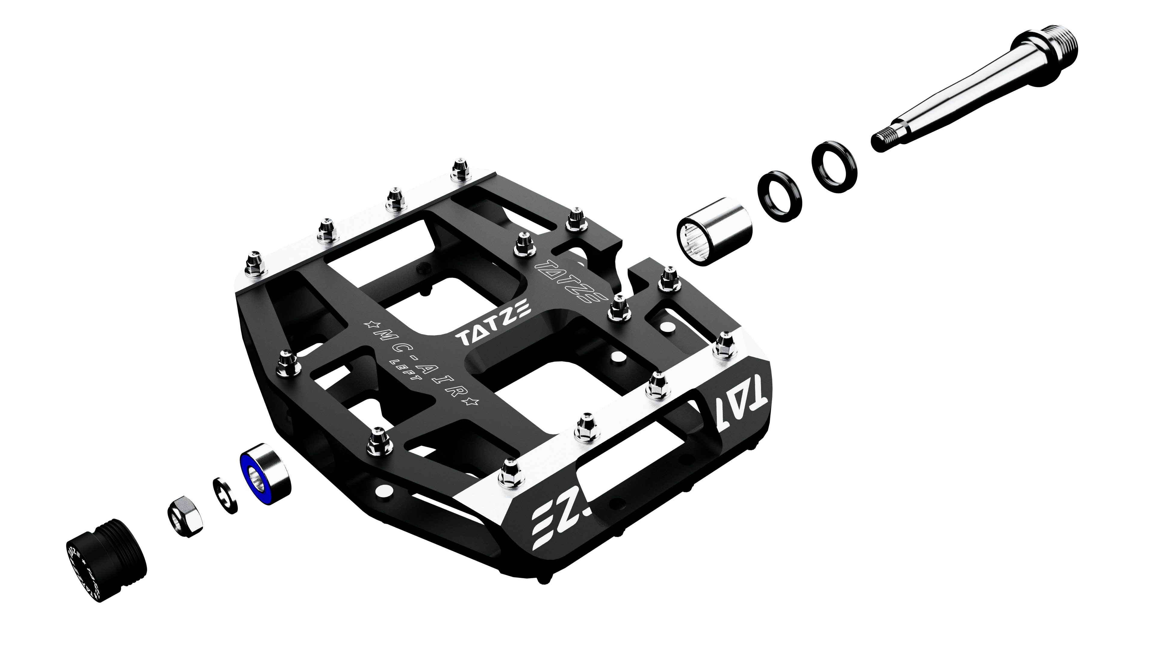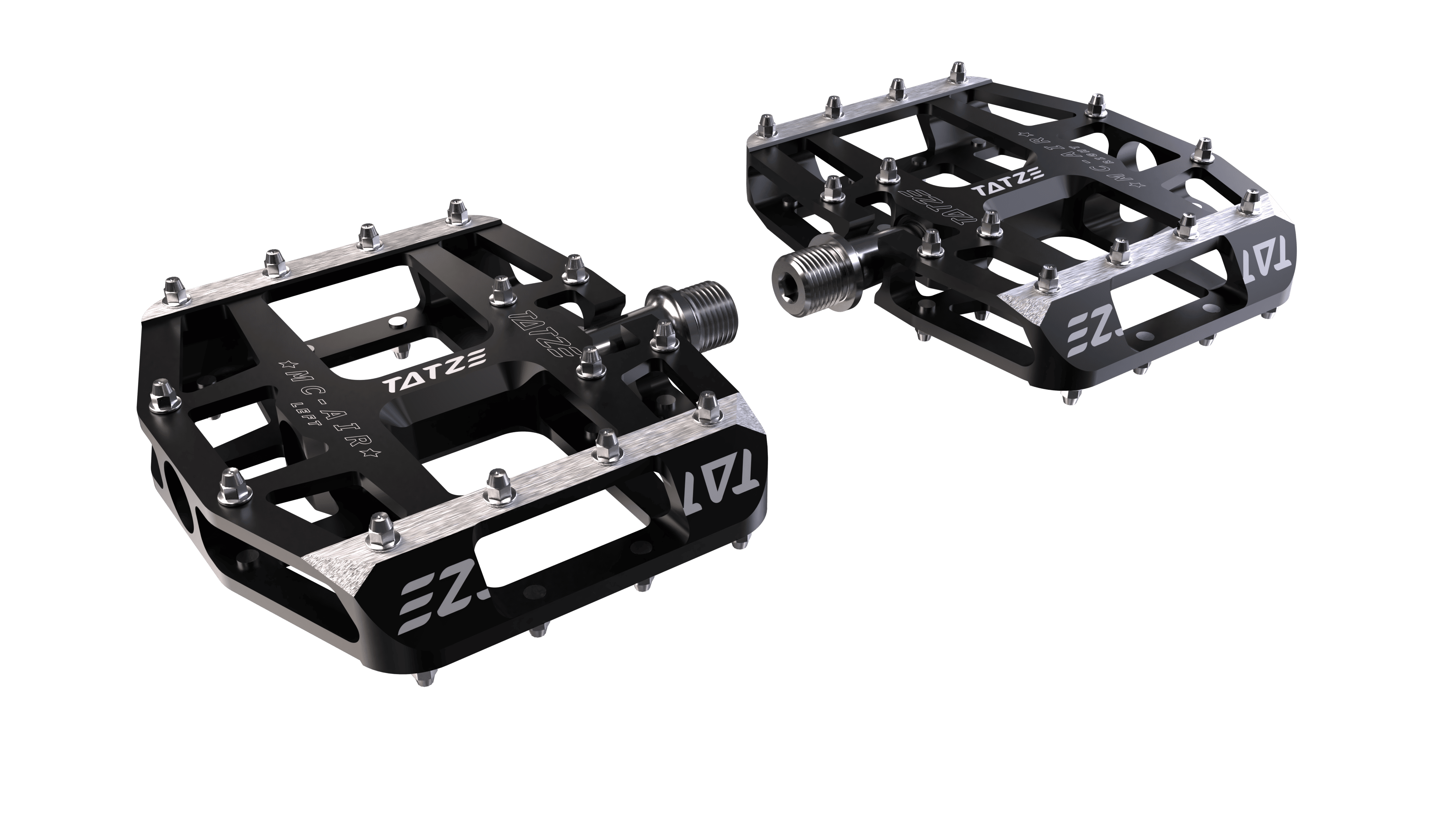 El MC-AIR con eje Cr-Mo es un pedal plano extremadamente potente. 14 pines con elevación específica garantizan un enorme agarre y una conexión especialmente estrecha entre el pedal y la zapatilla. Las dos filas de PIN en el interior garantizan un agarre suficiente, incluso si el zapato está un poco más alejado.
