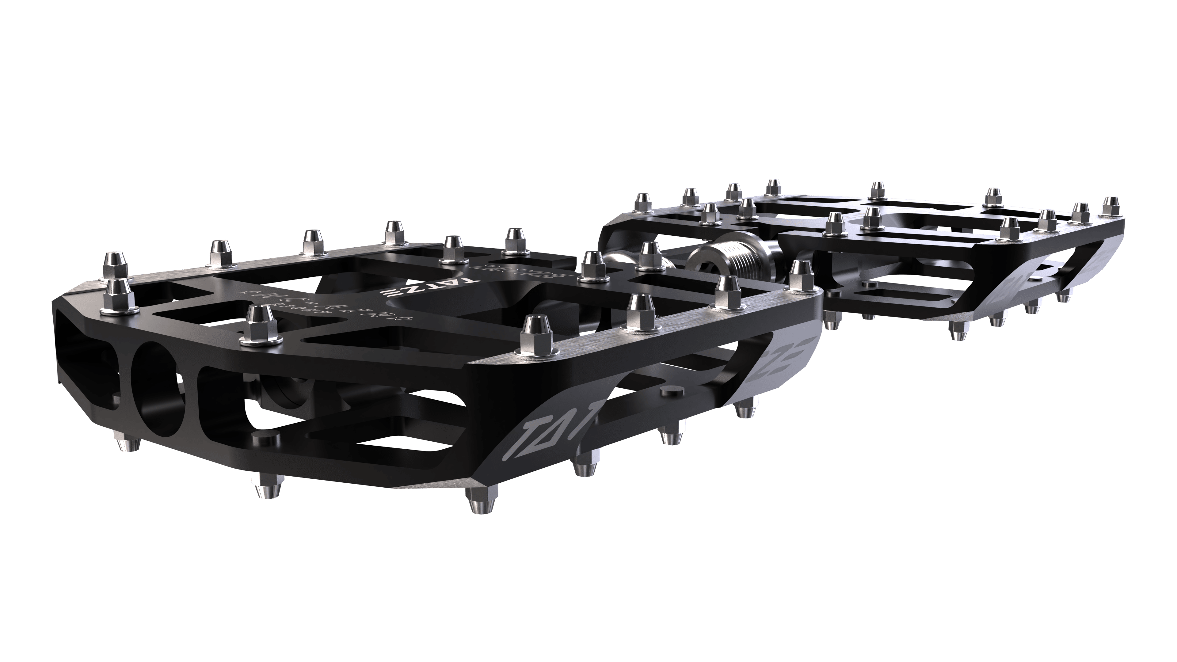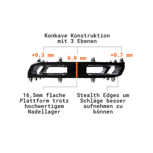 Die große Plattform mit 107x98x16mm (LxBxH) kombiniert einen sichern Stand bei gleichzeitig hervorragender Seiten- und Bodenfreiheit. Die Abgeschrägte Front mit Stealth Prallecken lässt das Pedal über Hindernisse gleiten und verhindert, dass sich Erde im Pedal sammelt.
