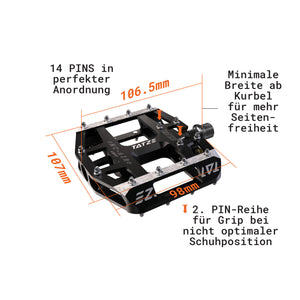 Das MC-AIR mit Cr-Mo-Achse ist ein äußerst potentes Flatpedal. 14 PIN´s mit gezielter Überhöhung sorgen für enormen Grip und eine besonders satte Verbindung zwischen Pedal und Schuh. Die zweireihigen PIN´s auf der Innenseite sorgen für genügend Grip, auch wenn der Schuh mal etwas weiter außen platziert wird.