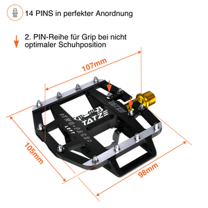 14 PIN´s mit gezielter Überhöhung sorgen für enormen Grip und eine Vertiefung in der Mitte des Pedalkörpers sorgt dafür, dass es keinen metallischen Kontakt zwischen Cleat und Pedal gibt.