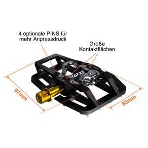 El pedal TWO-FACE con eje de titanio es un pedal plano extremadamente potente y al mismo tiempo un pedal de clic eficiente. 14 pines con elevación específica garantizan un agarre enorme, pero también hay una conexión particularmente fuerte en el lado del clic con 4 alturas. PINs regulables Pedal y zapata fabricados.