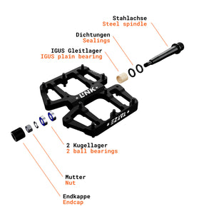 Das LINK verfügt über ein hochwertiges IGUS JSM Gleitlager innen und 2 nebeneinander verbauten Rillenkugellager außen. Zur Abdichtung werden 2 Doppellipennichtringe verbaut, welche die Lager vor Schmutz und Feuchtigkeit abschirmen. Die Lager- und Dichtungseinheit macht das Pedal nachhaltig im Sinne einer langen Lebensdauer. Zudem können Lager und Dichtungen mit dem optional erhältlichem Refresh-Kit in 5 Minuten erneuert werden um die Uhr wieder auf 0 zu stellen.